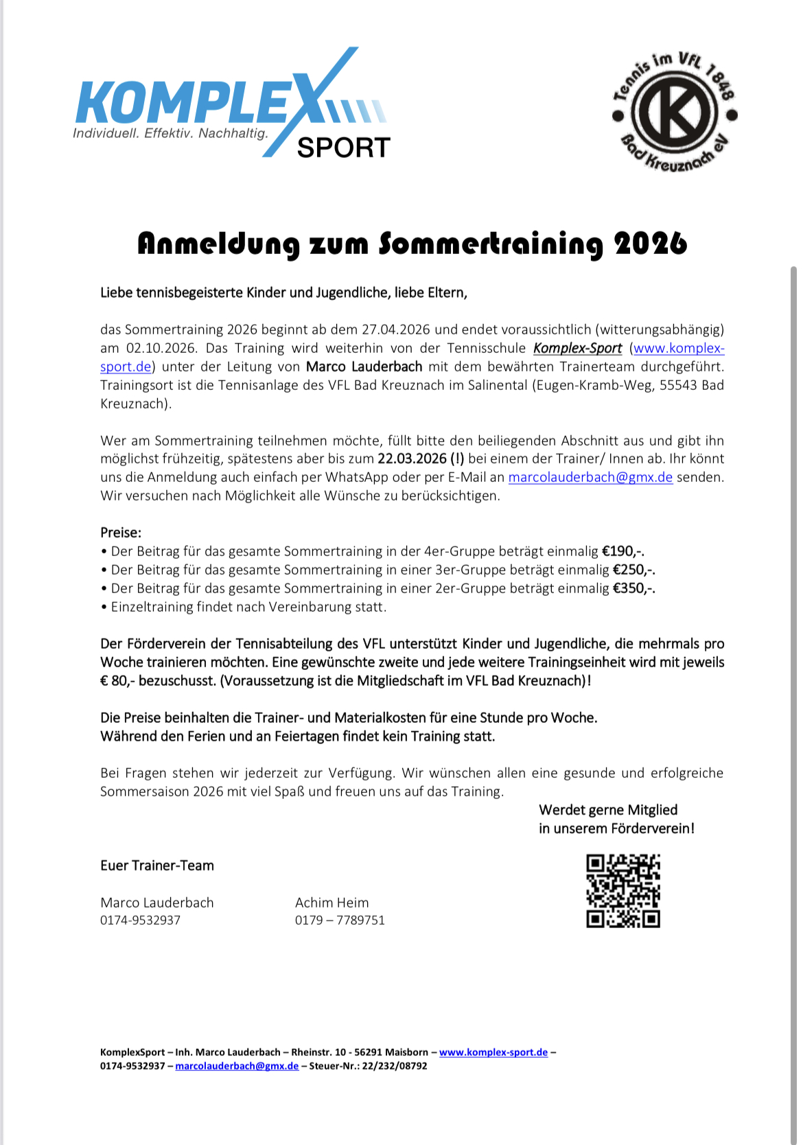Den Bildern könnt Ihr alle Details, wie Preise, mögliche Gruppengröße und genaue Zeiten entnehmen. Bitte gebt die Anmeldung bis spätestens 22.03.2026 (!) bei einem unserern Trainerinnen und Trainer ab. Ihr könnt uns die Anmeldung auch einfach per WhatsApp oder per E-Mail an marcolauderbach@gmx.de senden. Wir versuchen nach Möglichkeit alle Wünsche zu berücksichtigen.